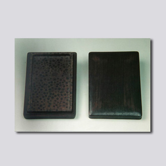 砚石质坚硬似玉,表面褐色内呈斑点状,酷似鲵鱼皮色,实属石中罕见品。砚身制作精细,棱角分明,砚膛平坦光滑,宜研彩墨。