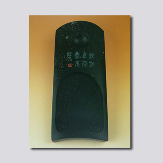 银星石产于山东的临沂,石质细润,色绀青,叩之声如金玉,上有点点银星。砚作瓦状,仿汉铜雀台瓦式砚。墨膛上方篆书“银河舟空,星光熊熊”八字。