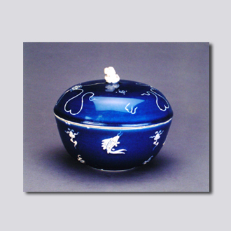 首都博物馆藏。敞口,深腹,圈足,狮钮盖,狮钮上无釉。通体施蓝釉,上有白色花纹,盖面装饰绣球纹,与狮钮共同组成狮子戏绣球图案。碗外壁装饰海浪鱼跃。其做法是先在胎体上堆出花纹,刻划形状,然后在没有花纹的地方施蓝釉,形成蓝釉白花。