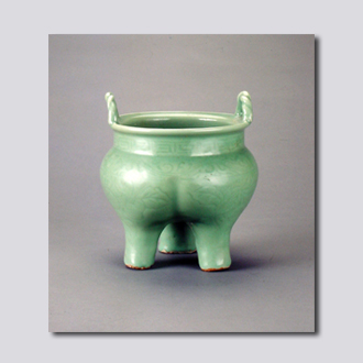 首都博物馆藏。仿古代青铜鬲造型。折沿,束颈,绳纹双耳。通体施青釉,釉下刻划三层纹饰:颈部为回纹,肩部饰卷草纹,三足分别刻折枝桃、柿子、石榴图案,纹饰刻划较随意。釉面肥润,有密集的细小气泡。