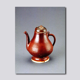 首都博物馆藏。直口,垂腹,高圈足,足内有2层台,弯流,曲柄,柄上附小圆系,半圆形盖。壶颈较元代稍短,比永乐时略长。胎质细而洁白。其表有旋坯痕,釉层较薄,呈酱褐色。这是洪武时期的典型器物。