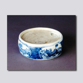 首都博物馆藏。鼓式,圆唇,腹微鼓,腹部饰青花开光海兽纹。底书青花双圈“大明崇祯年制”6字双行楷款。青花颜色较深。造型新颖而又不失古朴,为别具一格的文房用品。