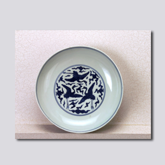 首都博物馆藏。侈口,弧腹,圈足,塌底。内心及外壁为嘉靖朝常见的云鹤饰纹,画风自然。底书青花双圈“大明嘉靖年制”6字双行行楷书款。釉色青白细润,胎薄体轻,青花色调浓艳。
