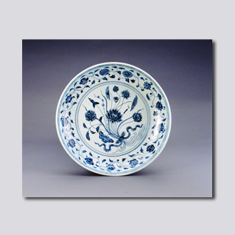 首都博物馆藏。敞口,弧腹,圈足。砂底,布满火石红。用苏泥渤青料绘画,盘壁内外画缠枝花卉,内心绘一束莲纹,束莲纹是明永乐、宣德时期常见的题材。