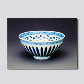 首都博物馆藏。敞口,敛腹,圈足。内口沿绘海水浪花纹,内壁绘缠枝花卉,碗心绘折枝枇杷,外口沿绘回纹一周,腹壁绘浓艳的菊瓣纹。胎质细白,白釉泛青,纹饰绚丽明快。