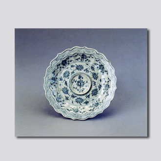 首都博物馆藏。花口折沿,花瓣形腹,圈足,托心凸起一圈以承盏。折沿绘卷草纹,内壁饰折枝牡丹和莲纹,内底环饰缠枝菊一周,中心为折枝莲,外壁为莲瓣纹。青花呈灰蓝色,胎质坚细厚重,釉质莹润肥厚。