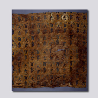 现藏首都博物馆。黄色缎地,片金织葫芦纹,绿色丝线织楷书“百事大吉”。
