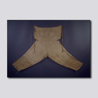 现藏首都博物馆。浅驼色八枚缎地,上施团龙戏珠及行云纹。形制宽大,前后各加一等腰三角形裤裆。裤腰上部前后各接一长方形护胸,上角缀缎带。左右裤口各有两个扣袢,两袢相隔16厘米,裤口镶4厘米的素缎边。裤腿36厘米处采用八搭晕和杂宝图案。