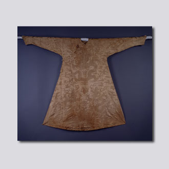 现藏首都博物馆。形制为圆领右衽,左右开裾,马蹄袖。浅黄色八枚暗花缎地。两肩、前后胸饰正龙各一,下摆前后行龙各二,底襟龙一,共九条龙。下摆为海水江牙、四合如意云及杂宝纹。
