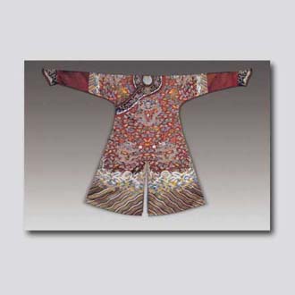 形制为圆领,右衽,斜襟,马蹄袖,四开裾直身长袍式,以绛色素缎做地,上施缉米珠绣九龙、捻金线绣寿字、五彩丝线绣蝙蝠、灵芝头云纹及海水江崖;制作上采用了钉线绣、穿珠绣、套针、戗针、打籽、钉金、缠针等刺绣方法,绣工十分精湛。