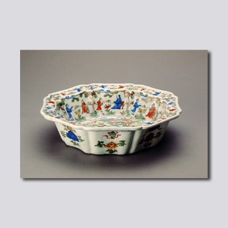 首都博物馆藏。窝角八棱形,宽板沿,浅腹,砂底。口沿部绘“王羲之爱鹅”与“林和靖爱鹤”图案,间隔排列。内壁及盆内底均绘“王羲之爱鹅”故事图案,共有13组。外壁绘花托八宝纹,通体以红、绿、黄、紫、褐诸彩,彩色艳丽,构图饱满。外底书青花双圈“大明万历年制”六字双行楷书款。布局繁密是万历时期瓷器的特征。