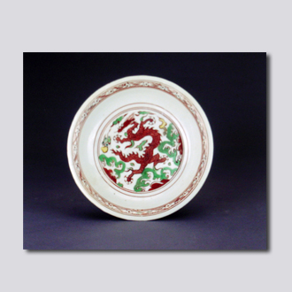 首都博物馆藏。撇口,弧腹,圈足。在白釉上以红、绿、黄彩绘海水云龙纹。龙身用针状工具划出鳞纹。双目白多黑少,十分突出,俗称“眼睛龙”。绿色泛黄,红彩鲜艳。外底用红彩书写“平遥府嘉靖丙申岁造”款。丙申是嘉靖十五年(1536年)。明代堂名款,以嘉靖、万历时期最盛。但既写干支,又书年号的款识很少见。平遥府应为明皇室子孙封于山西平遥住所之称。