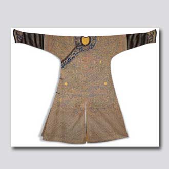 龙袍是清代皇帝吉服的代表。以明黄色缂丝卍字纹为地,施三色捻金线缂织龙、蝙蝠、灵芝云、十二章、海水江崖、立水八宝纹饰,以黄色三枚团龙江绸为里;形制为圆领,右衽,四开裾马蹄袖,直身长袍式。龙袍缂丝细腻,缂工精湛,质地紧密,构图规整。