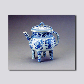首都博物馆藏。敞口,短颈,扁圆腹,腹下四柱足,直流,弯柄,弧形瓜蒂钮盖。盖面、颈部、把手及足部绘缠枝灵芝纹,腹绘朵莲托八吉祥纹。腹底书青花“大清道光年制”6字3行篆书款。纹饰清新疏朗,青花色泽鲜丽。这种盉壶仿自青铜盉,乾隆时创烧,嘉庆、道光朝均有烧制,造型、纹饰基本相同。