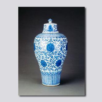 首都博物馆藏。小口,短颈,丰肩,敛腹,隐圈足,砂底,摇铃式盖。腹部绘缠枝番莲纹,肩部及腹下部饰变体莲瓣纹。肩部书青花“大明万历年制”6字楷书款。胎质洁白细腻,釉色白中泛青,青花色泽微微泛灰。