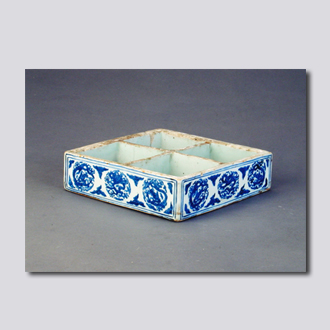 首都博物馆藏。四方形,直壁,平底,内分4格。盒外壁每面各绘3组团龙纹,团龙四周饰云纹。器底书青花双圈“大明隆庆年造”6字双行楷书款。胎坚质细,内施白釉,釉色泛青。青花色泽蓝中泛紫。造型大方,器型工整。