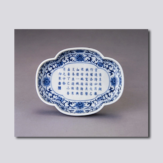 首都博物馆藏。海棠式口,浅腹,平底,底有条形足及多处支烧痕。内底心为海棠形开光,开光外均绘缠枝花卉,开光内书《御制诗》一首,署“嘉庆丁巳小春”,“丁巳”年,应为嘉庆二年(1797),属嘉庆早期之作。“御制诗”为清乾隆、嘉庆时期景德镇官窑瓷器的一种题材。