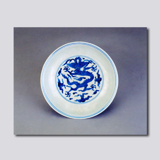 首都博物馆藏。撇口,弧腹,圈足。盘心微凹,圈足微向内敛。盘心饰五爪正面团龙纹,外壁饰二龙戏珠,外底书青花双圈“大明隆庆年造”6字双行楷书款。此盘胎质精细,青花颜色纯正,蓝中泛紫。因隆庆朝传世瓷器甚少而弥足珍贵。