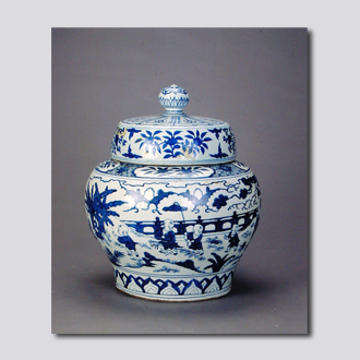 首都博物馆藏。直口,丰肩,收腹,隐圈足。宝珠钮盖,器盖绘仰莲、覆莲、云纹及折枝花果,肩部绘锦地开光花果,腹部纹饰以婴戏为主体。底书青花“大明嘉靖年制”6字双行楷书款。用回青料绘画,色泽艳丽,构图严谨,层次多而不乱。胎质精细洁白,釉汁肥润。