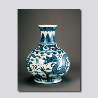 首都博物馆藏。侈口,束颈,鼓腹下敛,圈足外撇。口沿下饰海水和如意云纹,腹部绘首尾相逐的两条雄浑威武的行龙。底书青花“大清雍正年制”6字双行楷书款。造型秀美稳重。绘画细腻,纹饰生动自然,胎质精细洁白。