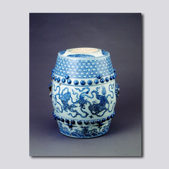 首都博物馆藏。鼓形,用两道鼓钉纹将墩体分为3层。上层饰梅花锦纹,中层绘两组双狮戏绣球,间以贴模印铺首相隔;下层为寿山福海纹。墩面边缘有4朵对称的荷叶,中心镂雕反瓷牡丹。青花色泽为灰蓝色。