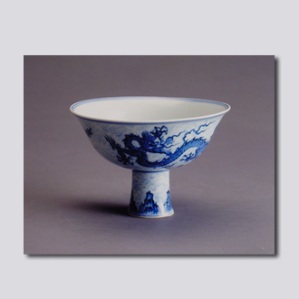 首都博物馆藏。撇口,弧腹,高足中空。内壁印两条暗龙纹。外壁以浅淡的海水纹衬托色泽浓重的游龙,足柄绘浅淡的海水烘托浓艳的寿山,对比强烈。碗心书青花“大明宣德年制”双圈楷书款。工艺精湛,标志着宣德时期对青花料的控制已经达到较高的水平。胎质洁白细腻,白釉泛青,碗壁呈半透明状。