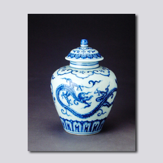 首都博物馆藏。直口,短颈,丰肩,收腹圈足。肩饰6组如意云头纹,内饰梅花。腹壁饰两条首尾相逐的香草龙,近底处饰莲瓣一周。底书青花“大明宣德年制”6字双行楷书款。造型规整秀美,笔法酣畅豪放。
