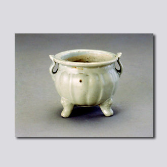 首都博物馆藏。折沿,束颈,瓜棱腹,平底,三兽足。肩两侧贴对称带状双系,内口沿及器外施卵白釉,三足满釉,底部支烧,故外底有窑渣和支烧痕迹。釉层较厚,釉色白中微泛青。该器出土于元代墓葬,墓主张弘刚是元朝初年重臣,葬于元大德九年(1305年),因而此炉为有明确纪年的元代卵白釉器。