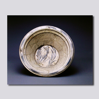 首都博物馆藏。敞口,卷沿,斜壁,砂底,隐圈足,底足无釉。白釉下施化妆土,外壁施半截黑釉。盆沿饰水草圆点纹,内壁绘白地黑花斜线纹,内心为鱼藻纹,鱼游于水藻间,水波暗动,极为形象。