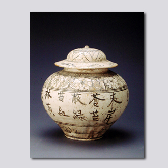 首都博物馆藏。直口,短径,鼓腹,隐足圈,宝珠钮盖。盖面绘3层边饰,肩绘缠枝牡丹纹,腹部以黑彩书诗一首:“游十洲:夹岸苍苔蔽绿苔,红林黄叶画屏开,彩船遥指十洲去,一派韶音天畔来。”书法苍劲,朴拙脱俗。