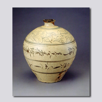 首都博物馆藏。小口,短颈,丰肩,鼓腹,平底。4道弦纹将纹饰分为3部分,肩部用黑彩绘婴戏莲纹,下腹绘折枝花卉,中腹部题草书七言绝句诗一首:“寻慎悟入蓬莱捣(岛),香花不断松花老。采芝何处未归来,白云满地无人扫。至元十八年。”黄褐色釉,胎质较粗。现存元代用诗文作装饰并有年款之器甚少,弥足珍贵。