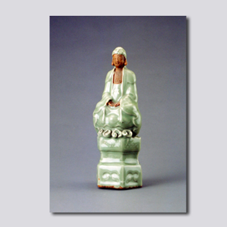 首都博物馆藏。此尊头顶肉髻微隆,面相沉静,大耳垂肩,上身披双领下垂式袈裟,下身着僧裙,胸前饰有表示吉祥的“卍” 字符号。结跏趺坐于莲花座上,双手结禅定印。脸、胸及手裸露部分,不施青釉,呈赭褐色。莲花座下承以束腰6棱基座,基座上层6个棱面印各种花卉,束腰部分装饰卷草纹,下为垂云纹。胎体厚重。