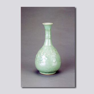 首都博物馆藏。撇口,细长颈,溜肩,垂腹,圈足。颈部饰3道弦纹,腹部印凸花海水云龙纹,展示了行龙出没于汹涌大海的场景。胎质细腻呈青灰色,釉质纯净,青中闪绿。器物制作规整,是元代龙泉窑的上乘之作。