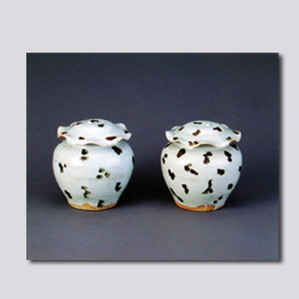 首都博物馆藏。收口,丰肩,砂底无釉。荷叶形盖,盖上刻荷叶茎脉纹。通体施青白釉,釉色青白莹润,罐体点褐彩斑纹。青釉褐彩,相映成趣。