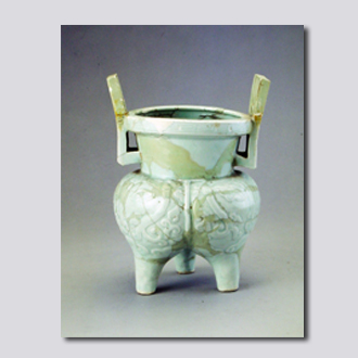 首都博物馆藏。洗口,束颈,双立耳,袋形腹,柱足。仿青铜器分档鬲形。口沿刻云雷纹一周,腹刻凸起的饕餮纹。胎体厚重、坚硬,釉色光洁莹润。