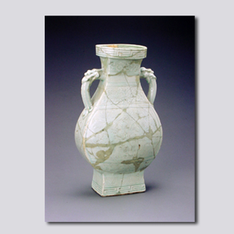 首都博物馆藏。椭圆形盘口,束颈,扁圆腹,高足。颈两侧分别贴塑龙首曲柱式双耳。口沿及底足处各刻回纹一周,颈部刻折枝莲花,腹部刻划牡丹纹,足刻蕉叶纹和回纹。通体纹饰采用雕、刻、划、塑多种技法装饰。胎体厚重,造型古朴。