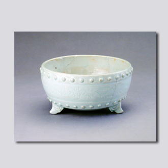 首都博物馆藏。敞口,浅腹,平底,底部承以兽面三足。内外施青白釉。内心及外底均无釉,口沿及近底处各环饰一周整齐的乳钉纹,外壁刻串枝莲花。器表釉色光润,造型别致。