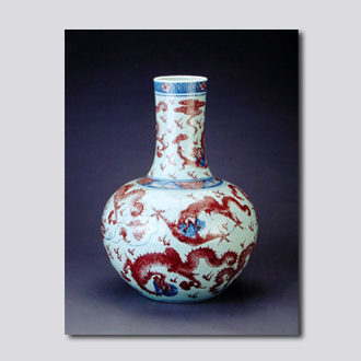 首都博物馆藏。直口,长颈,丰肩,鼓腹,卧足。底书青花“大清乾隆年制”6字3行篆款。通体绘9条4爪螭龙。釉里红呈色稳定,与青花相互衬托。深浅浓淡和谐,因其腹部浑圆呈球状,故称天球瓶。