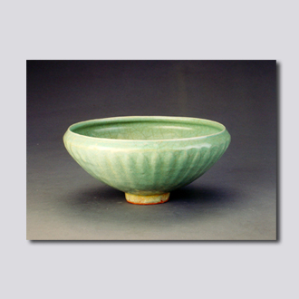 首都博物馆藏。敛口,弧腹,小圈足,足脊无釉。内外施青釉。内壁刻大朵莲花,外壁刻菊瓣纹。釉色青翠,釉层厚润,有细碎冰裂纹。