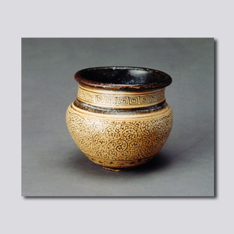 首都博物馆藏。唇口外卷,束颈,溜肩,腹微鼓,圈足。口部及器里、肩部、圈足为酱彩,其间分别绘回纹、缠枝蔓草纹、仰莲瓣纹。纹饰线条纤细,构图饱满,造型浑朴、粗犷。底部墨书“朱家工夫”楷书款,此种款识在吉州窑瓷器中是很少见的。吉州窑位于江西吉安县永和镇,故又称“永和窑”,创烧于五代时期,宋元时期瓷业有很大的发展,是宋代江南地区著名的民间瓷窑。蔓草纹是由卷草纹变化而来,是吉州窑常见的纹饰,由于它滋长延伸,蔓蔓不断,被人们寄予一种茂盛、长久的吉祥寓意。