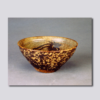 首都博物馆藏。侈口,斜腹内敛,浅圈足,内外壁施灰褐釉。器内饰紫黑色的鸾凤蛱蝶纹,为吉州窑特有的剪纸贴花工艺,外为玳瑁斑纹。胎体为黑色。剪纸贴花的做法是先在坯体上施一层含铁量高的釉,将剪纸纹样贴上,然后再施一层含铁量低的釉,揭掉剪纸,高温烧成,浅色的“地”上形成酱黑色剪纸纹样。外壁的玳瑁斑是采用两种不同含量的氧化铁釉料,在器的外部均匀地涂赭黑色釉,次洒黄釉斑点,烧成玳瑁状窑变纹样,色泽如海洋动物玳瑁的甲壳。吉州窑的剪纸贴花工艺是中国古代黑釉瓷器中的名贵品种,它具有一种别有韵味的艺术感染力。