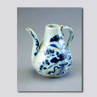 首都博物馆藏。直口,垂腹,平底无釉。弯流,曲柄,柄上附小圆系。腹部绘束莲纹,流绘火珠纹。胎骨致密洁白,釉质细润,青花色泽浓重,白釉闪青。梨式壶始见于元代,流行于明代,因形似梨,故名。
