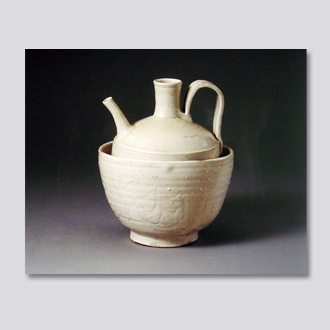 首都博物馆藏。注壶和温碗组成一套温酒器。注壶口沿微侈,折肩,圆腹,胫内收,圈足外撇。一侧颈肩之间连以带状曲柄,另一侧肩部置管状流。通体施白釉,釉下施白色化妆土,足内无釉有支烧痕,腹部刻折枝花,花纹淳朴自然。釉色白中泛黄,施釉较厚,釉面莹亮,釉下有明显的旋坯纹。温碗敞口,深腹,圈足。通体施白釉,釉下有白色化妆土,外壁施釉不到底,内心有四条支烧痕。外壁刻折枝花。胎质略粗,胎体坚实。注壶和温碗为宋辽金时期流行的一套温酒器,与盏托、盏盘配套使用。