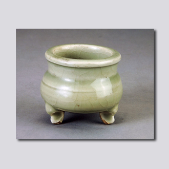 首都博物馆藏。折沿,直口,束颈,鼓腹,平底,下承以三兽足。通体施青釉,釉面光洁莹润有大开片,造型小巧别致。