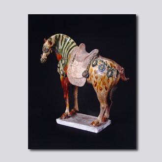 首都博物馆藏。明器。马立于长方形扁平托板上,马头左偏略下垂,表现瞬间动态,极为自然生动。鬃毛饰绿彩,自然下垂。身体呈枣红色,鲜丽明快,膘肥体壮,四肢健硕,腿部肌肉表现写实,自然,应为捏制。鞍鞯齐备:头有当卢、络头、镳、衔,颈佩攀胸、杏叶,背负鞍鞯、障泥、马镫,尻饰秋、杏叶、束尾。鞍为后桥倾斜鞍,鞍后垂有鞘。鞍鞯、障泥皆无釉,但装饰华美、立体感很强,是主人身份高贵的象征。从其未罩鞍袱来看,应是一匹正在骑用的良马。唐三彩是对唐代三彩铅釉陶的简称,以白色粘土为胎,用铜、铁、钴、锰等金属为釉料的着色剂,使釉在烧制过程中粘度小,流动性大,易垂流、晕散并可降低烧制的温度。其烧制工艺是两次烧成,先在1100℃左右高温下烧素坯,然后在已素烧过的胎体上施釉,再经900℃低温烧成。一般有黄、绿、蓝、白等多种色彩,以黄、绿、白色为主。唐三彩工艺始创于唐高宗时期,至玄宗时达到鼎盛,主要用于陪葬。