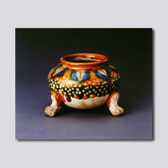 唇口,束颈,丰肩,鼓腹,圜底,下承以三兽足。炉口、颈施以深黄釉,肩部饰以三彩叶状纹,层次分明,腹部施以蓝、白釉。釉色色彩斑斓,黄、白、蓝、绿等颜色相互交融浸润,给人一种美的质感。胎质洁白坚致,莹润细腻。