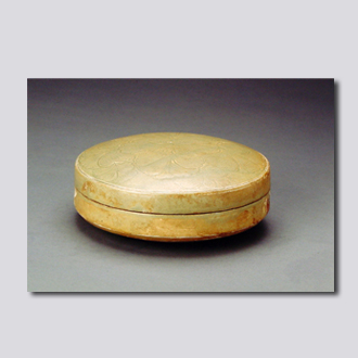 首都博物馆藏。子母口,盖微隆起,直壁,圜底。底面满釉,有十多个支烧痕。盖缘刻凹弦纹一周,盖面满刻牡丹纹。胎色灰白,胎质细腻,釉色青中泛黄。盒为唐代最流行的梳妆用品盛具。越窑在今浙江余姚、慈溪、上虞一带,唐属越州,故名。汉代始烧,历两晋、南朝至唐代,成为南方著名青瓷窑,唐、五代至宋初的越窑,以胎质细腻、釉色莹润和刻花图案精美而负盛名。