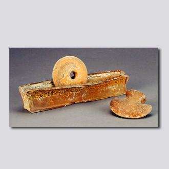 首都博物馆藏。由碾槽、碾轮及钺形铲组成。外壁施黄绿色釉,施釉不到底。碾轮为扁圆形,中间微鼓,有一圆孔用以安装木轴,无釉。碾槽为长方形,中间有凹槽,胎质粗硬。