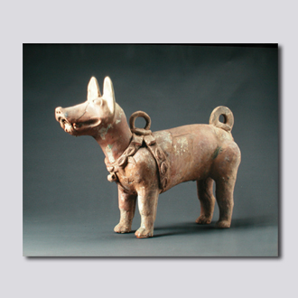 首都博物馆藏。泥质红陶。明器。立姿。口部微张,双目前视,双耳耸立,颈与胸之间有系带,并连接着链环,尾巴上卷,四肢直立有力,肌体壮硕,栩栩如生。