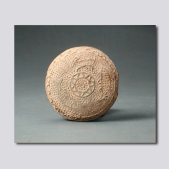 首都博物馆藏。泥质灰陶。扁圆形,两面模印花纹,边缘为锯齿纹,中心为花卉纹,中间以细小乳钉为底纹,印有鱼纹动物图案。轻轻摇之,哗哗作响。